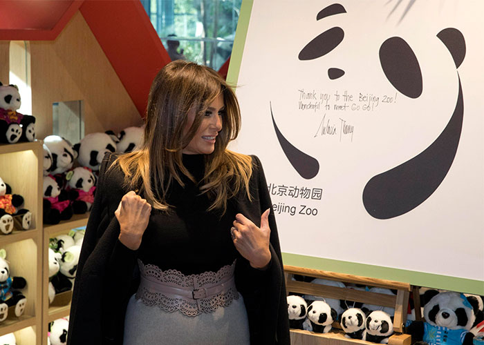 Melania llegó al zoológico de la capital china a primera hora de este viernes dónde un grupo de escolares la recibió cantando y agitando pequeñas banderas de China y EEUU mientras ella les acompañaba dando palmas y saludaba muy sonriente.