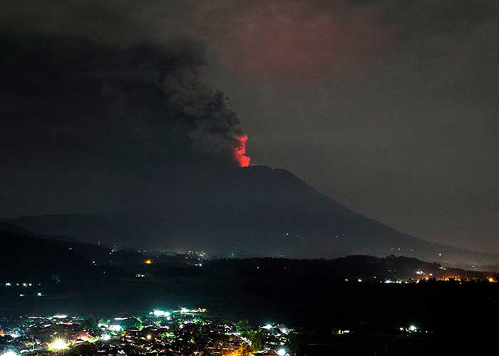 Además una columna de ceniza de hasta 2.000 metros de altura por encima del cráter se ve desde el puesto de observación del volcán en el subdistrito Rendang, a unos 12 kilómetros del volcán, mientras que en el aeropuerto internacional Ngurah Rai de la isla continúan operando los vuelos.