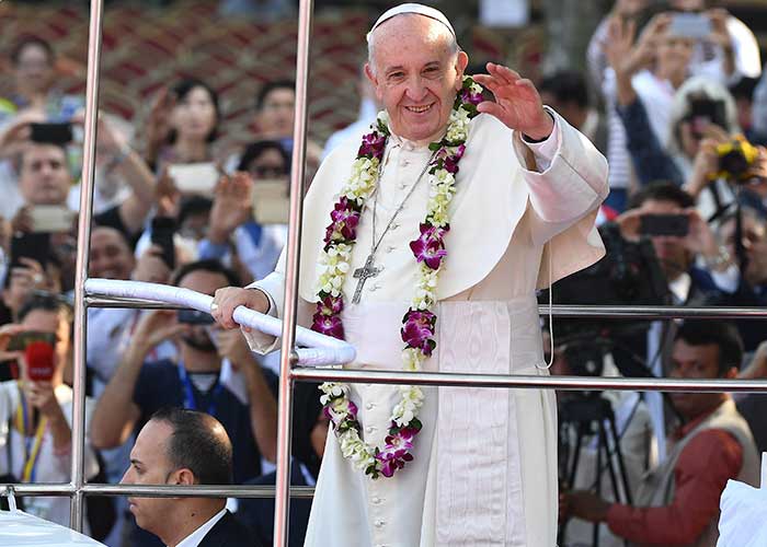 El papa acudió al arzobispado de Dacca, que comprende la catedral, la casa para los sacerdotes ancianos y un seminario, para encontrar como hace habitualmente en cada viaje a los obispos de este país, que aquí son solo siete.