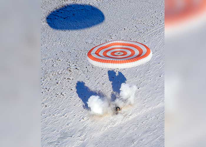 La capsula soyuz que trasladó al astronauta de la NASA Randy Bresnik, al cosmonauta ruso Sergey Ryazanskiy y a Paolo Nespoli, de la Agencia Espacial Europea, descendió con un paracaídas rojo y blanco y aterrizó según lo previsto a las 14:37 horas (0837 GMT) en las vastas estepas en las afueras de una localidad remota de Kazajistán.