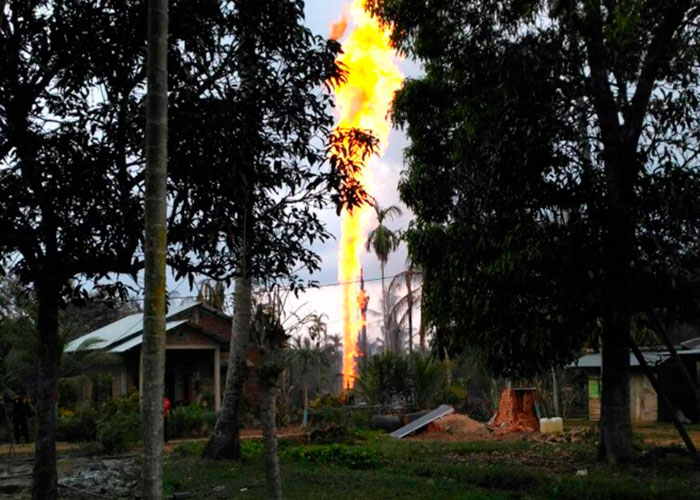 El incendio, registrado en el pozo de la localidad de Pasi Putih, en el este de Aceh, comenzó a las 01:30 de la madrugada del miércoles y se mantiene activo, dijo el portavoz de la Agencia Nacional de Mitigación de Desastres, Sutopo Purwo Nugroho. Cinco casas próximas ardieron.