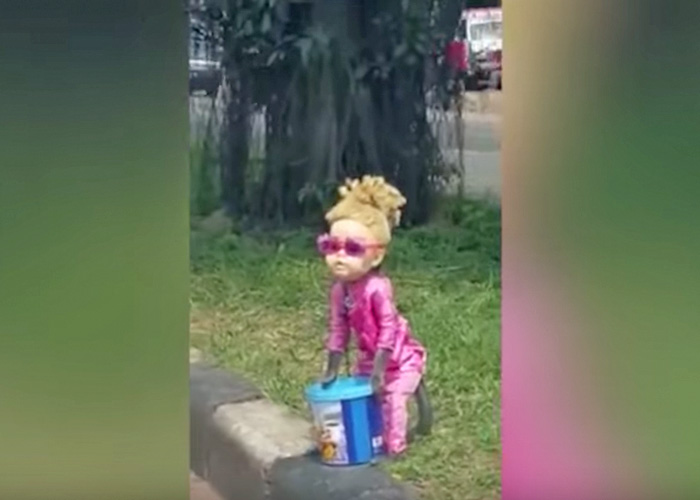 Mono es disfrazado de muñeca para pedir limosna (VIDEO)