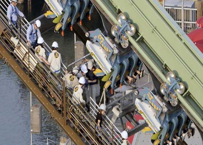 El parque de diversiones indicó que la montaña rusa Flying Dinosaur se detuvo a la mitad del recorrido de 1.100 metros y dejó a los pasajeros suspendidos en posición inclinada a unos 30 metros (100 pies) de altura.