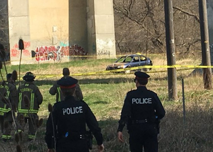 Police are investigating this car dangling from a bridge beside the DVP. If you have any information on who/what/why, please contact @TorontoPolice. pic.twitter.com/CKptWpXbCR