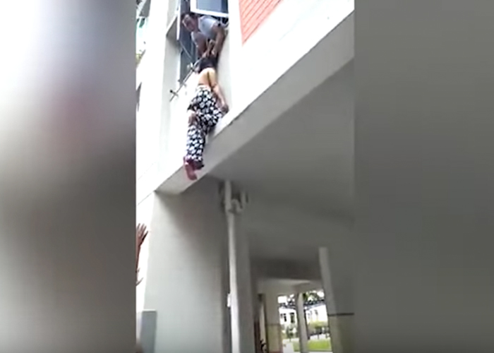 Una mujer habría estado arreglando el tendedero de un edificio, cuando de pronto resbaló siendo milagrosamente sujetada de los pelos por un hombre que se encontraba en el segundo piso. El hecho ocurrió en Tampines, Singapur, y las imágenes se viralizan en YouTube.