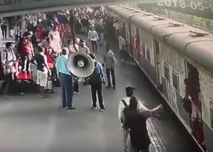 Un hombre salvó la vida de una niña que por poco fue aplastada por un tren en una estación de Bombay (India), un hecho que fue registrado por una cámara de vigilancia situada en el andén.
