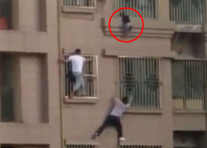 Dos transeúntes de una zona urbana del condado de Lianjiang (China) salvaron a un niño que estaba a punto de caer de una ventana, al trepar cuatro pisos por el muro del edificio, informa Mail Online.
