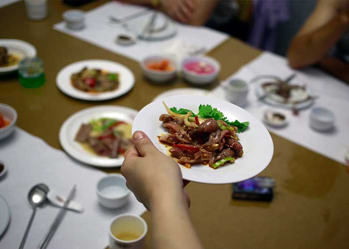 El menú del restaurante cuenta con más de una canción de platillos con carne de perro, incluyendo costillas, patas y piel hervida de perro.