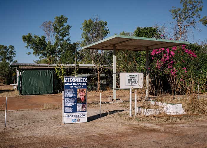 Ocho meses después de que Paddy Moriarty (70 años) desapareciera, un cartel con su fotografía, un teléfono y el pedido de ayuda continúa firme en Larrimah, Australia. Los 11 habitantes del perdido pueblo del norte del país lo ven todo los días. Y todos creen que lo mismo: que alguno de allí sabe qué ocurrió con el viejo Moriarty.