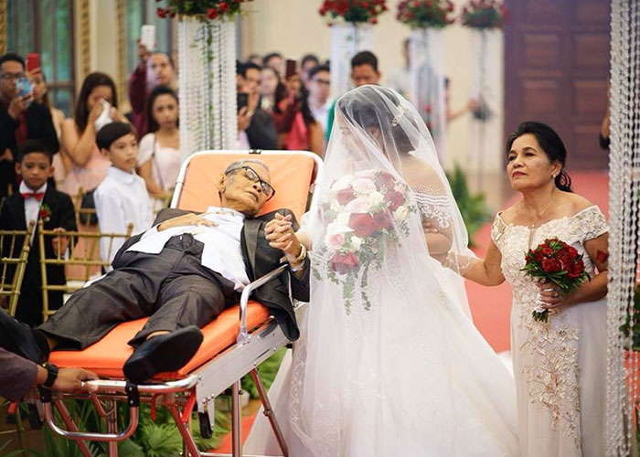 Familiares y organizadores de bodas ayudaron a tirar de la camilla hacia el altar mientras el moribundo sostenía la mano de su hija.