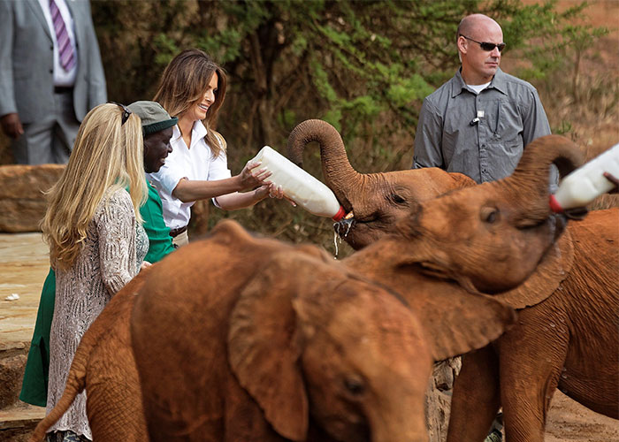 La primera dama de Estados Unidos, Melania Trump, dio este viernes el biberón a crías de elefante e hizo un breve safari por Kenia, la tercera etapa de su gira africana en solitario, alejada del alboroto de Washington.