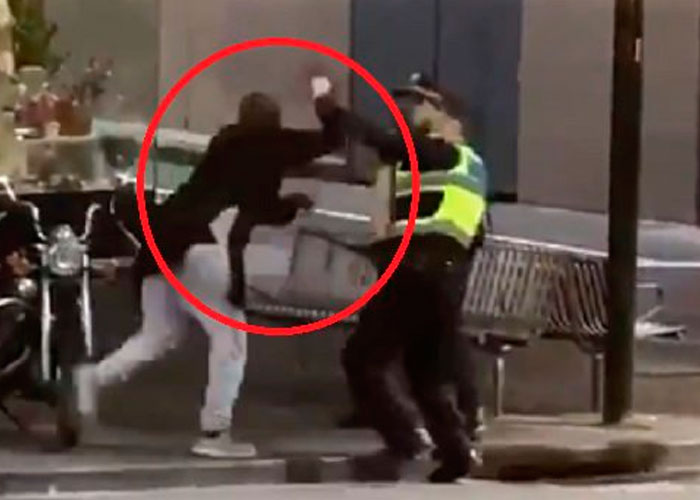 Vidéo de l'assaillant de #Melbourne qui a fait 1 mort et plusieurs blessés. Il s'en prend cette fois aux policiers à coups de couteau, mais il va le payer par un joli trou dans la poitrine ? #Australie pic.twitter.com/tFaI3Mx90W