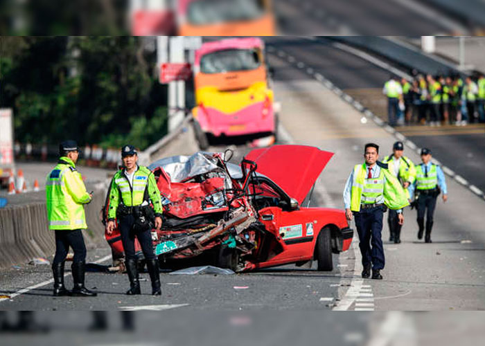 Al menos cinco personas murieron y 32 resultaron heridas este viernes en la colisión de un taxi y un autocar que iba rumbo al aeropuerto de Hong Kong, indicó la policía.