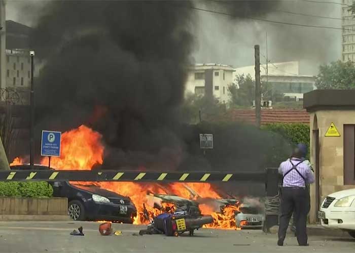 #AlMomento | #FOTOS: Se reporta explosión y tiroteo en hotel de #Nairobi en #Kenia. Aún no se sabe si se trata de una toma de rehenes o de un atentado.