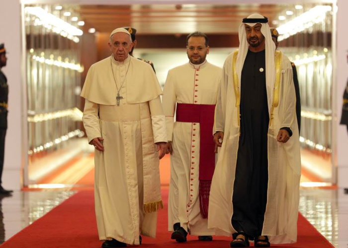 Francisco fue recibido por el príncipe heredero de Abu Dabi, sheik Mohamed bin Zayed al-Nahyan y por el iman de Al-Azhar, la institución faro del islam sunita (basada en El Cairo), sheik Ahmed al-Tayebiman.