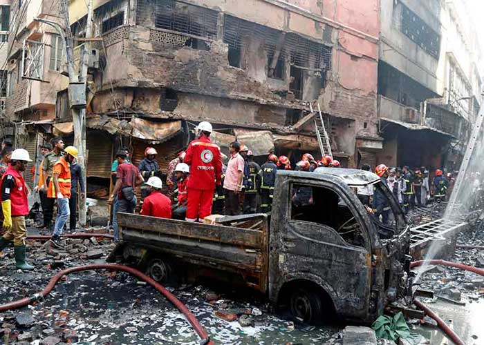 El área en la Vieja Daca está cargada de apartamentos, tiendas y almacenes y los bomberos pasaron trabajos para llegar al sitio del incendio a causa de los estrechos callejones en el barrio. Las autoridades y activistas han indicado que el almacenamiento de material inflamable, así como la sobrepoblación, tuvieron un papel en el siniestro.