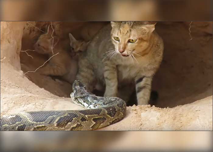 Un gato se enfrenta a una enorme víbora que "amenazaba" con triturar a sus crías, y cuidado a la madre también.