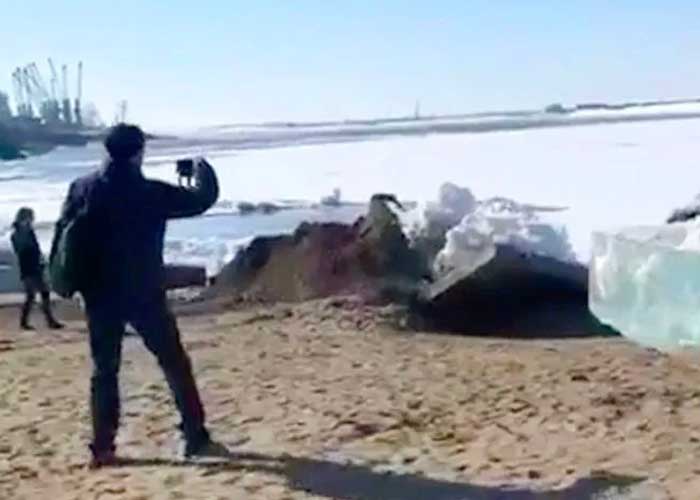Alina Vysotskaya publicó a través de Instagram un video del momento en que un grupo de ciudadanos se acerca a la orilla para ver el ‘tsunami de hielo’ y deben retroceder ante los enormes bloques que emergen desde las aguas.