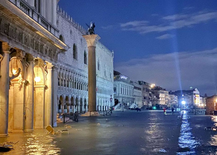 Hacia medianoche, el Centro de Mareas indicaba que las mareas habían subido en torno a 1,87 m, la mayor "acqua alta" desde el récord de 1,96 m, registrado el 4 de noviembre de 1966.