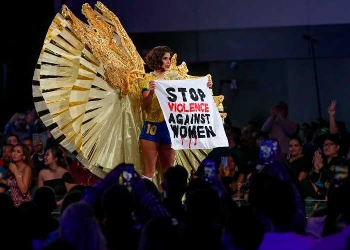 Al llegar al final de la pasarela, Miss Brasil cambió su sonrisa por un rostro muy serio y sacó entonces una pancarta en la que se leía "Stop Violence Against Women" ("Stop a la violencia contra las mujeres") antes de dar una vuelta sobre sí misma para mostrarla a todo el público presente en el acto.