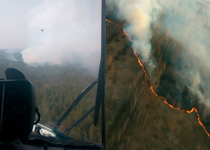En una grabación hecha desde un helicóptero este domingo se ve que el fuego arde en las proximidades de la ciudad abandonada de Prípiat y de la planta nuclear que estalló en abril de 1986.