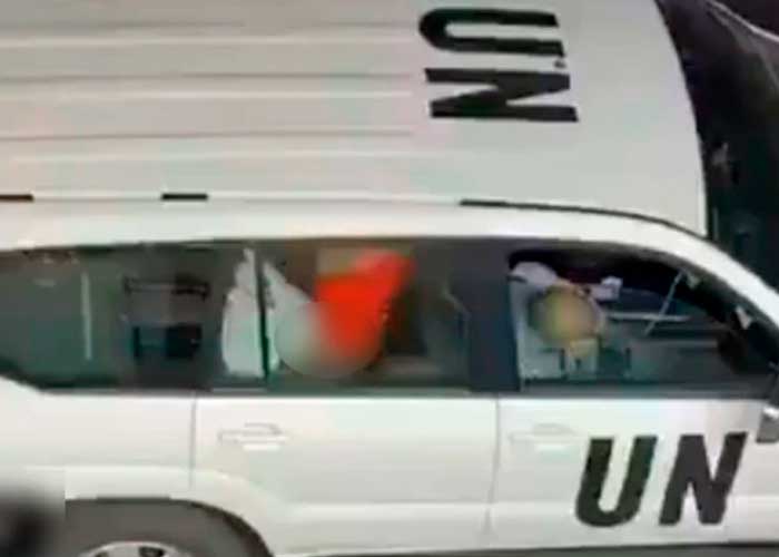 En las imágenes se aprecia a un hombre con una mujer sentada en sus piernas en el asiento trasero de un vehículo oficial de la ONU que circula por la ciudad de Tel Aviv.