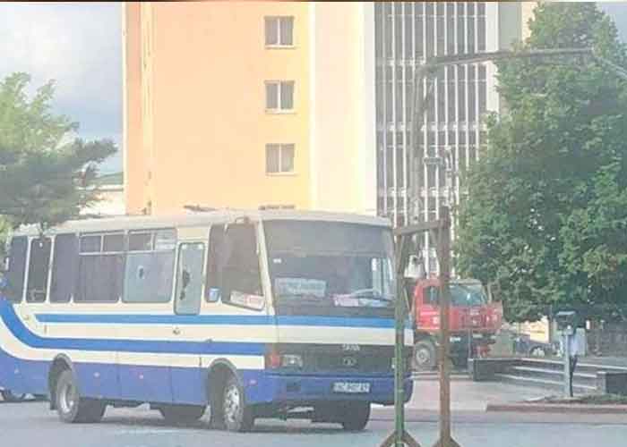 El autobús, con la cortinas echadas, se encuentra en la plaza del Teatro de Lutsk, que ha sido rodeada por efectivos policiales, señaló el periódico digital ucraniano korrespondent.net .
