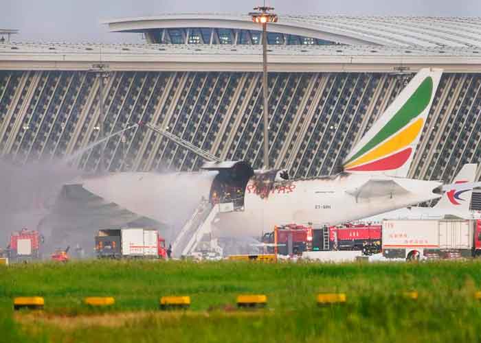 A Boeing 777 cargo plane belonging to Ethiopian Airlines caught fire at Shanghai Pudong Airport today. Eighteen fire trucks from five nearby fire stations were sent to put out the blaze. No casualties have been reported yet. pic.twitter.com/mWl4zApXoz