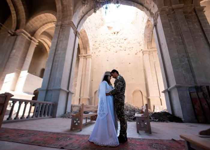 Hovhanés Hovsepián y Mariam Sargsaián se casaron este 24 de octubre en la catedral del Santo Salvador en Shushí, en Nagorno Karabaj, que fue bombardeada el 8 de octubre por las fuerzas azerbaiyanas. Azerbaiyán, a su vez, ha negado haber atacado el edificio.