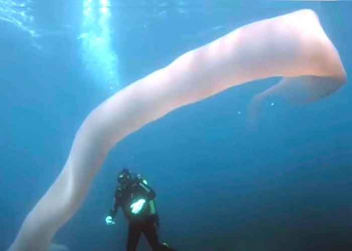 Buceaban tranquilamente en aguas de la costa de Whakaari, una formación de origen volcánico de la isla Blanca (Nueva Zelanda), cuando observaron lo que en principio podía parecer una enorme bolsa de plástico y, visto más de cerca -y después de comprobar que se movía por sí mismo-, incluso les hizo pensar en un monstruo marino.