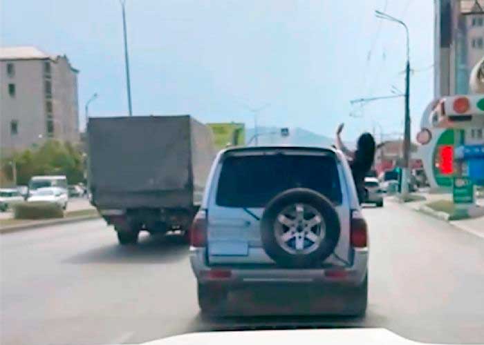 A través de varias fotos que se han viralizado en las redes sociales, se aprecia la tremenda caída que sufrió una mujer de una camioneta «todoterreno» cuando se trataba de sacar una selfie en una carretera de Daguestán, Rusia.