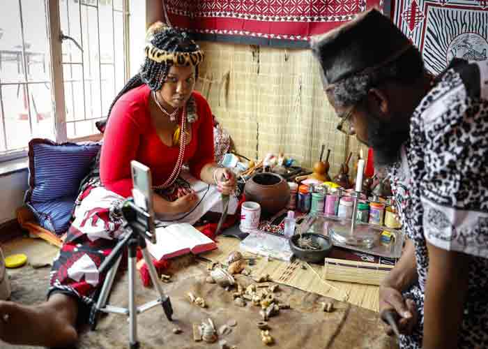La curandera Makhosi Malatji agarra los huesecillos y coloca su celular en un trípode. Como la mayoría de las curanderos de Sudáfrica, desde que apareció el coronavirus, ofrece sesiones de rituales ancestrales en línea.