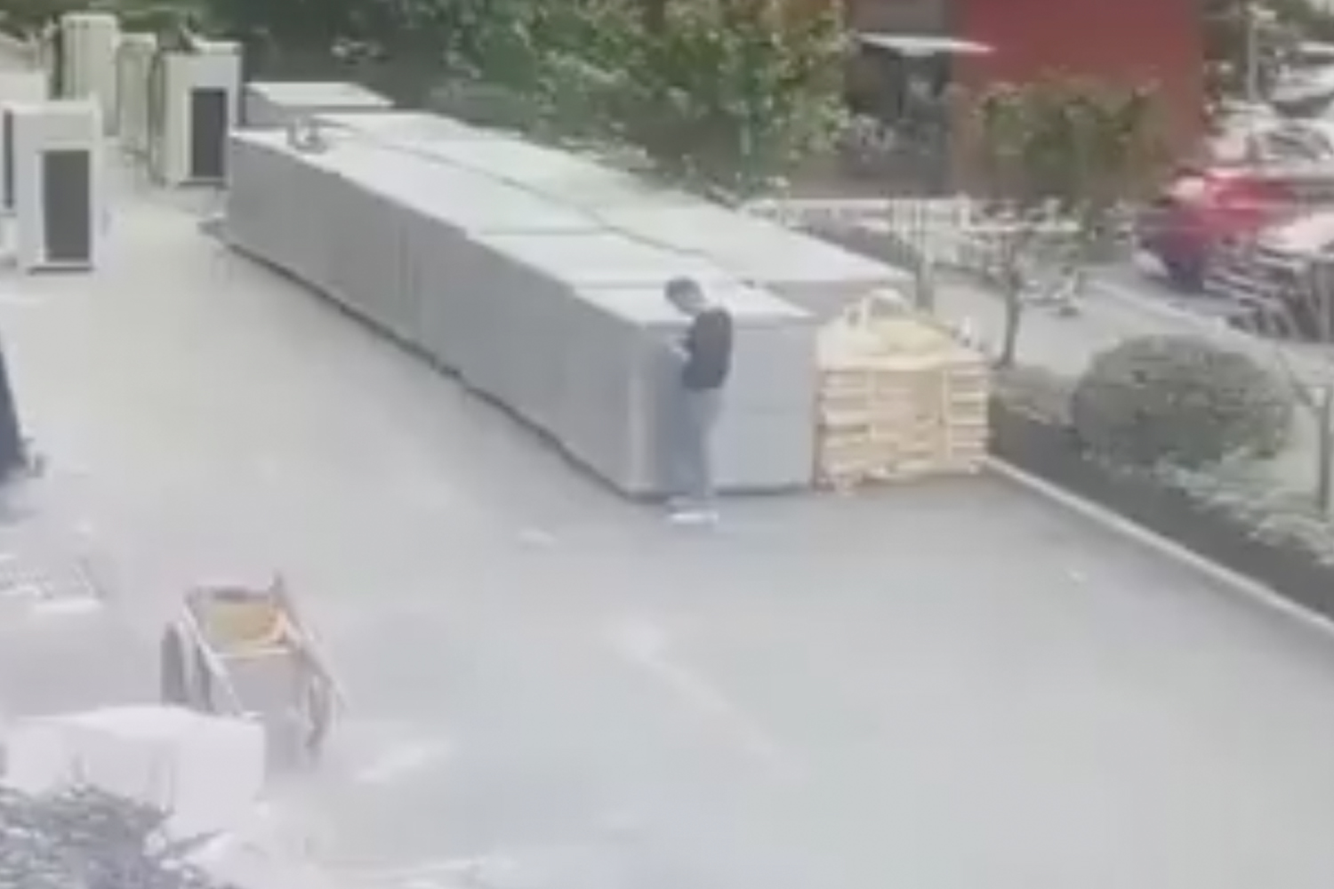 El momento quedó registrado por una cámara de seguridad ubicada en el sitio de la obra. En las imágenes se ve cómo el trabajador reacciona en cuestión de segundos, corre hacia una pila de bloques de cemento y se agacha para protegerse, justo antes de que la grúa impacte el suelo.