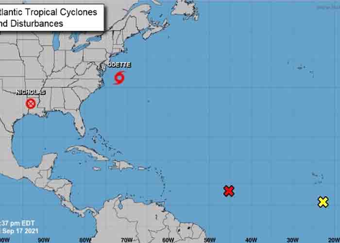 Ubicada 225 millas (365 kilómetros) al sureste de Cape May, en Nueva Jersey, y 325 millas (525 km.) al sursuroeste de Nantucket, en Massachusetts, Odette se mueve a 15 millas por hora (24 km/h) con dirección noreste.