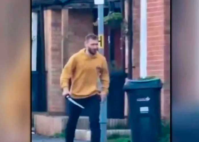 Un video difundido por medios británicos muestra a un hombre con una chaqueta amarilla con capucha que sostiene una espada o un cuchillo largo caminando cerca de las casas de la zona.