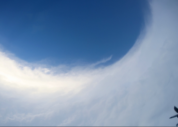 El ojo del huracán es una zona relativamente tranquila de hasta decenas de kilómetros de diámetro, rodeada por la pared del ojo —la zona de vientos más intensos— y donde se observaron olas que parecen moverse en sentidos contrarios. Esta dinámica puede deberse al fuerte viento periférico que empuja el agua hacia dentro mientras que corrientes internas circulan en sentido contrario, generando un espectáculo visual inesperado.