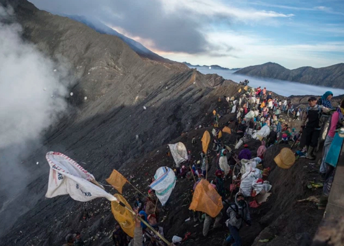 Todos los años, los miembros de la tribu Tengger se reúnen en las tierras altas de los alrededores para arrojar frutas, verduras, flores e incluso cabras y pollos al cráter del volcán del Monte Bromo, como parte del festival Yadnya Kasada.