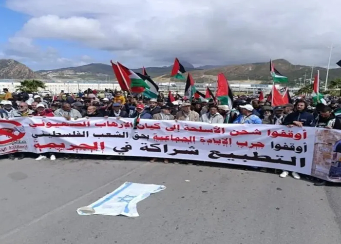 La marcha, convocada por el Grupo de Trabajo Nacional por Palestina, incluyó bloqueos en las carreteras aledañas al puerto y consignas como; «No a las armas de genocidio en aguas marroquíes».