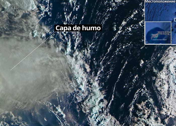 La agencia espacial rusa Roscosmos este domingo ha compartido en su cuenta de Twitter imágenes captadas por uno de sus satélites que muestran desde el espacio la enorme capa de humo generada por el Hunga-Tonga-Hunga-Ha’apai, el enorme volcán submarino que el sábado entró erupción en Tonga. «La constelación de satélites rusos realiza una observación de la zona»; reza la publicación.