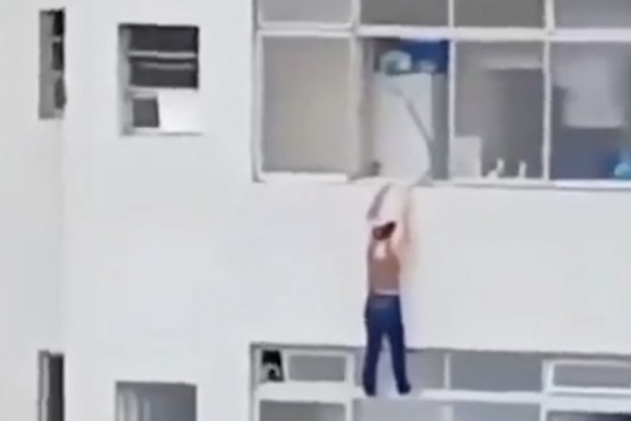 La mujer, con ambas manos sujetando la ventana, apoyaba sus pies en el piso inferior mientras intentaba no caer; la angustiante escena fue registrada por vecinos de una torre.