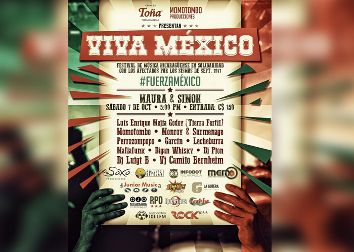 Este sábado 7 de octubre se viene un evento muy bonito para recaudar fondos que sirvan para ayudar a las víctimas del terremoto en México, el cual dejó más de 300 muertos en ese país. ¡Viva México! es el nombre de este concierto a realizarse en Maura & Simón, Managua, con la presencia de muchos artistas de la escena musical de Nicaragua.