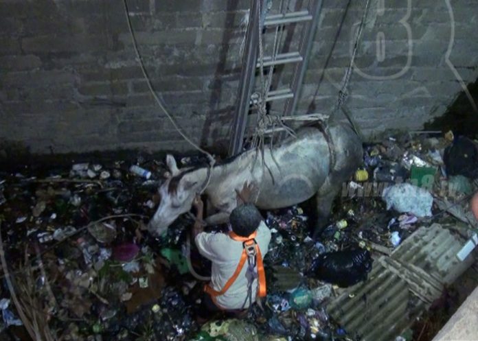 Según relato de testigos el equino andaba pastando y por tratar de alcanzar un zacate paso directo al fondo del cauce repleto de basura y aguas residuales.