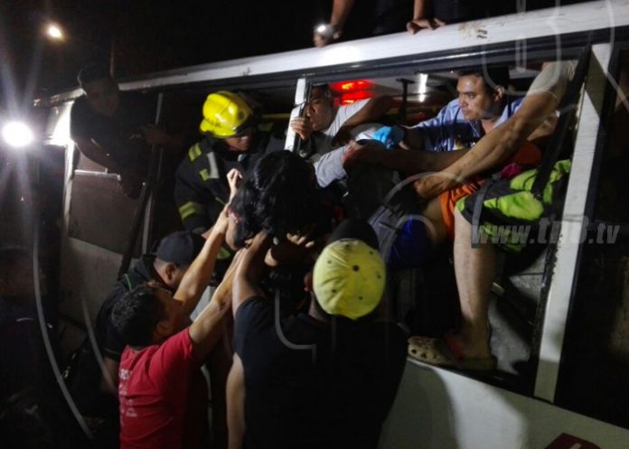 Bomberos y paramédicos trabajan el rescate de las personas prensadas en autobús involucrado en accidente en Pista El Dorado. pic.twitter.com/Q6GMqaIwFf— TN8 Nicaragua (@canaltn8) March 1, 2017