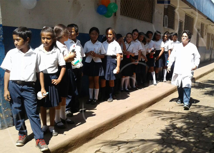 Médicos odontólogos del Centro de Salud Francisco Buitrago, en Managua, realizaron este miércoles la aplicación de flúor y orientaron a los niños y niñas estudiantes sobre el cepillado de dientes para prevenir enfermedades bucales o caries.