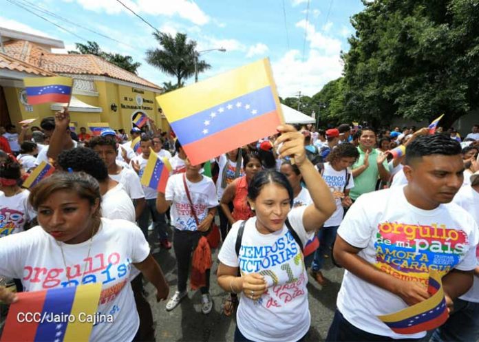 Estos jóvenes nicaragüenses se desbordaron en alegría y fervor revolucionario, quienes leyeron un pronunciamiento que entregaron al embajador venezolano Javier Arrúe, el cual se mostró agradecido por ver a esa juventud que representa todo ese apoyo del pueblo nicaragüense, de los trabajadores y del Gobierno que dirige el Comandante Daniel Ortega y la Vicepresidenta Rosario Murillo.