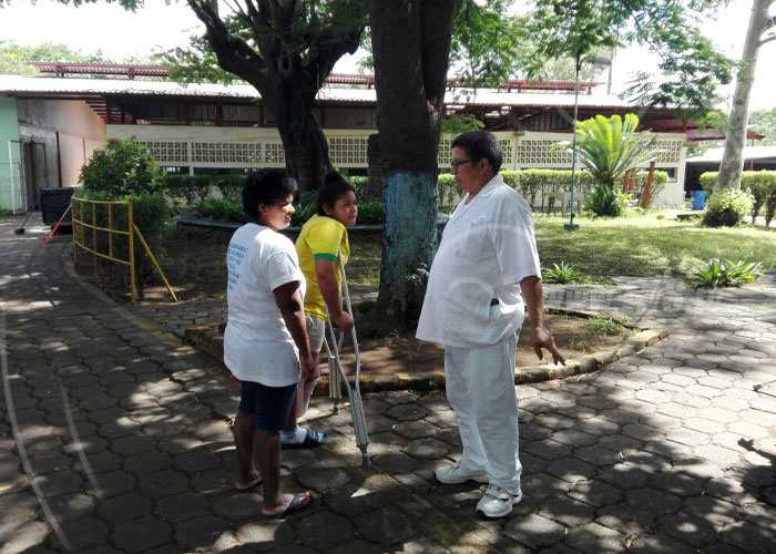 En este centro de terapia encontramos a doña Ana Aracely Hernández acompañando a su hija Aracely, quien al estar jugando le cayó una loseta de cemento, amputándole uno de sus pies, ahora espera que le pongan la prótesis a la adolescente para regresar a Bluefields, Región Autónoma de la Costa Caribe Sur de Nicaragua, lugar donde reside.