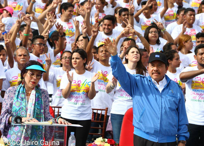 La plaza La Fe, lució llena de alegría, el rojo y el negro son los colores emblemáticos de la Revolución que cumplió este 19 de julio 38 años en el corazón del pueblo sandinista que ratifica el respaldo total al Gobierno por su buena gestión.
