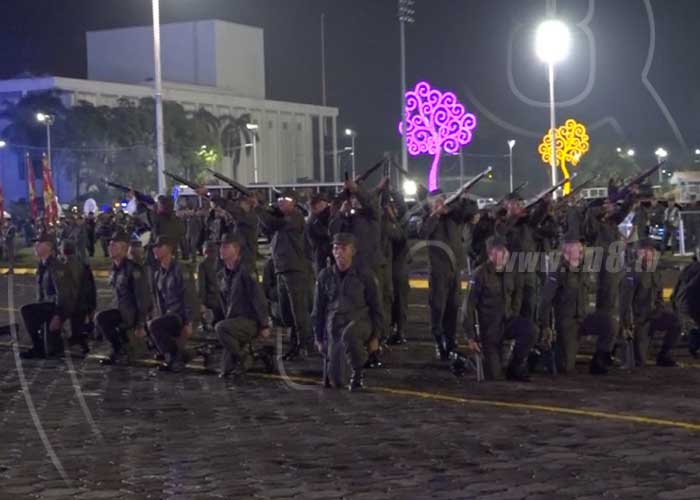 La noche de este miércoles continuaron las prácticas del desfile militar que realizará el Ejército de Nicaragua para deleite de las familias nicaragüenses. Desde el pasado lunes los destacamentos y unidades de la institución castrense practican en la plaza San Juan Pablo Segundo para afinar los detalles, maniobras, logística, coordinación y orden que caracteriza el desfile que podrá ser presenciado por las familias, el próximo sábado en saludo a sus 38 años de constitución del Ejército.