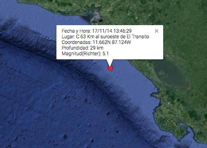 A eso de la 1:46 pm de este martes se registró un sismo de 5.1 grados en la escala de Richter, con su epicentro a 63 kms al suroeste de El Tránsito, con una profundidad de 29 kilómetros, según el reporte del INETER. No existen reportes inmediatos de mayores incidencias en la población o daño a infraestructuras.
