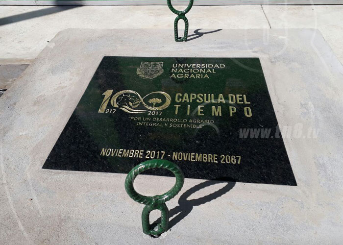 Esto se realiza como parte del centenario de la Universidad Agraria. "En el interior de la cápsula se depositaron elementos representativos de la época y símbolos de la identidad agraria de la UNA, tales como su marco normativo, el libro de los primeros cien años de historia institucional, fotografías, broches y reconocimientos, un celular de la época así como el mensaje de nuestro rector para las futuras generaciones sobre el reto de conservar y preservar nuestra tierra", expresó Ivette Sánchez, secretaria general de la UNA.
